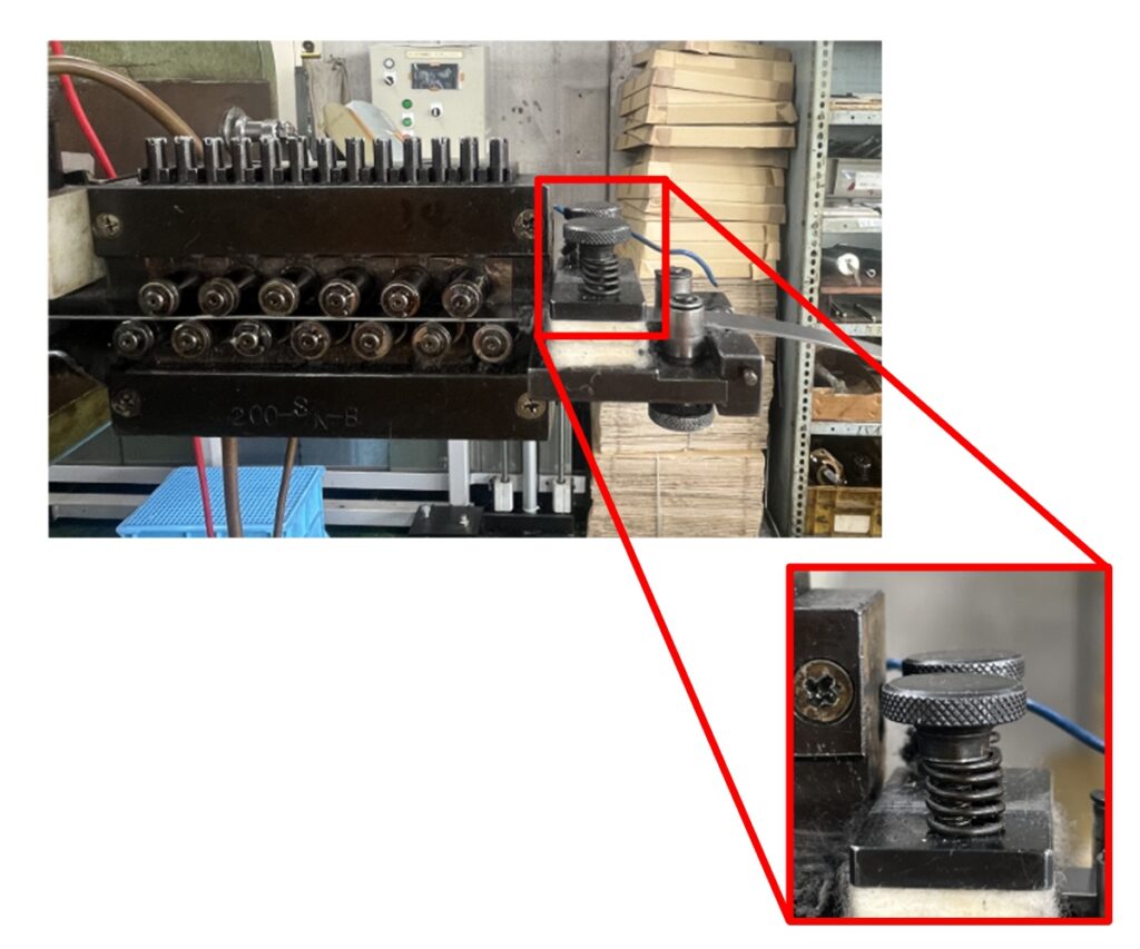 ばねの役割 | ➀材料の固定グリッパーの接圧力調整 ➁固定グリッパーを戻す。 ➂材料送り長さのオーバーテンションに用いる。 |