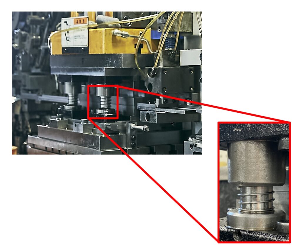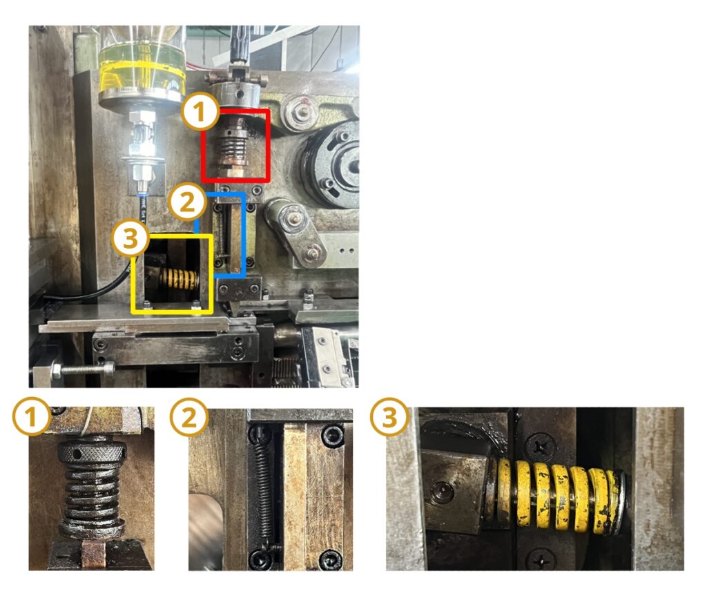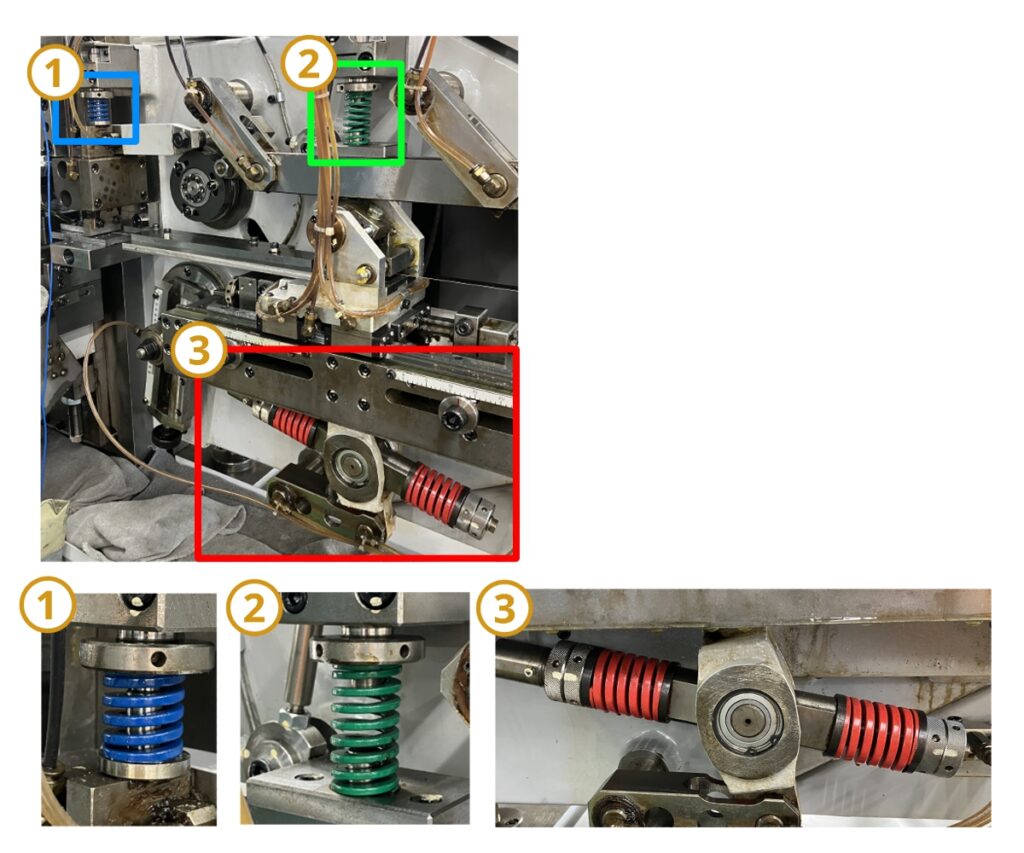 ばねの役割 | ➀材料の固定グリッパーの接圧力調整※1 ➁移動グリッパーの接圧力調整 ➂材料送り長さのオーバーテンション※2に用いる。 |