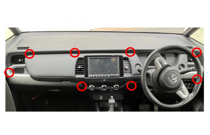 インストルメントパネル(インパネ)の周囲全体を複数のばねが囲い、固定しています。カーナビ等の付け替え時に、インパネを外すと見ることができます。当社の板ばねを使用することで、振動への耐久と他のパーツと干渉を最小限にすることを可能にします。