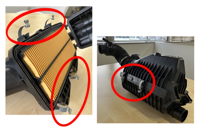 エンジンに取り込む空気を綺麗にするエアクリーナーのフィルターを入れるボックスに使われています。板ばね「クランプホルダー」を使用することでエンジンの振動への耐久性と、ボックス開閉の容易さを両立しています。